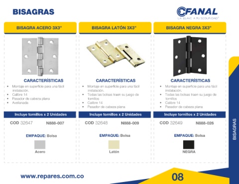 BISAGRA ACERO 3X3” BISAGRA LATÓN 3X3” BISAGRA NEGRA 3X3”