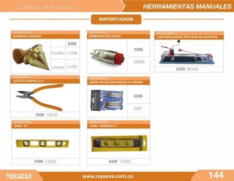 > IMPORTADOS HERRAMIENTAS MANUALES COD PEQUEÑA 14768 23604 GRANDE 14767 COD 26449 IMPORTADOS JUEGO DE SACABOCADOS X 6 PIEZAS COD 7087 COD 13316 COD 13292 COD 13293 �J2are�r www.repares.com.co 144