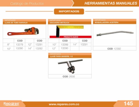 HERRAMIENTAS MANUALES IMPORTADOS COD COD COD 1 1 COD 8" 13279 12" 13281 10" 13289 14" 13291 1 O" 13280 14" 13282 12" 13290 COD 12392 COD 2656 �J2are�r www.repares.com.co 145