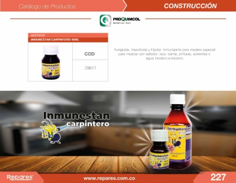 CONSTRUCCIÓN PROQUIMCOL Beneficio Puro ADITIVOS INMUNESTAN CARPINTERO 40ML Fungicida, Insecticida y Fijador. lnmunizante para madera especial COD para mezclar con sellador, laca, barniz, pinturas, solventes o agua; incoloro e inodoro. 29617