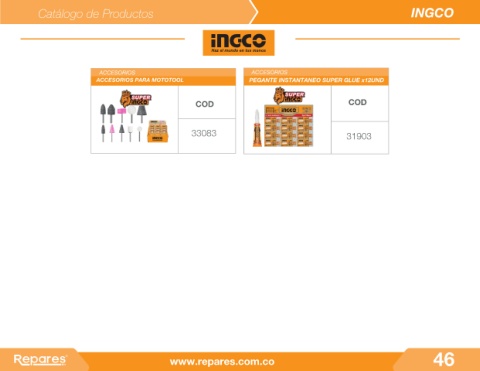 Catálogo de Productos INGCO ACCESORIOS ACCESORIOS ACCESORIOS PARA MOTOTOOL PEGANTE INSTANTANEO SUPER GLUE x12UND COD COD 33083 31903 www.repares.com.co 46