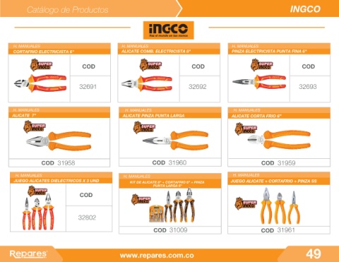 CORTAFRIO ELECTRICISTA 6" ALICATE COMB. ELECTRICISTA 8" PINZA ELECTRICISTA PUNTA FINA 6"