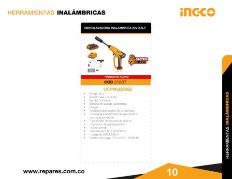 HIDROLAVADORA INALAMBRICA 20V 2.8LT