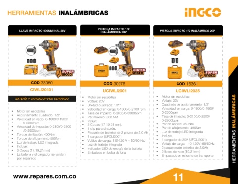 LLAVE IMPACTO 400NM INAL 20V INALÁMBRICA 20V PISTOLA IMPACTO 1/2 INALÁMRICO 20V
