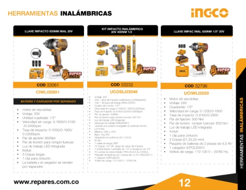 LLAVE IMPACTO 850NM INAL 20V 20V 400NM 1/2 LLAVE IMPAC INAL 500NM 1/2" 20V