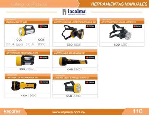 LINTERNAS > HERRAMIENTAS MANUALES LINTERNA SUPER LED FA+ii:iiii COD COD 220 LM 32949 270 LM 32950 COD 18331 COD 32501 COD 29652 COD 29651 LINTERNAS COD 29650 COD 29652 �J2are�r www.repares.com.co 11 O