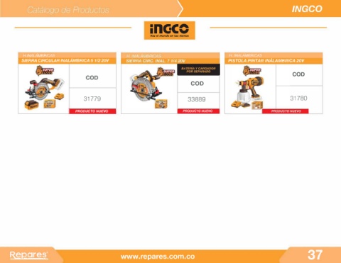 > inocc INGCO Haz el mundo en tus manos H.INALÁMBRICAS H. INALÁMBRICAS SIERRA CIRCULAR INALÁMBRICA 5 112 20V PISTOLA PINTAR INÁLAMBRICA 20V COD COD COD 31779 33889 31780 1 PRODUCTO NUEVO PRODUCTO NUEVO ------ �P-are� ® www.repares.com.co 37